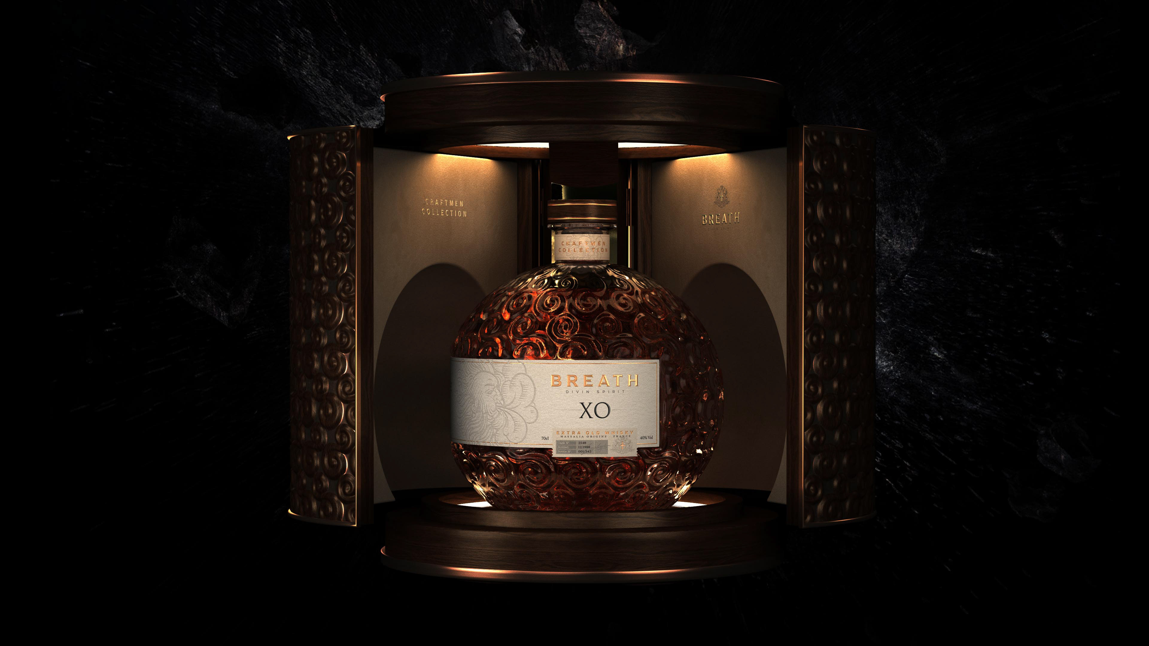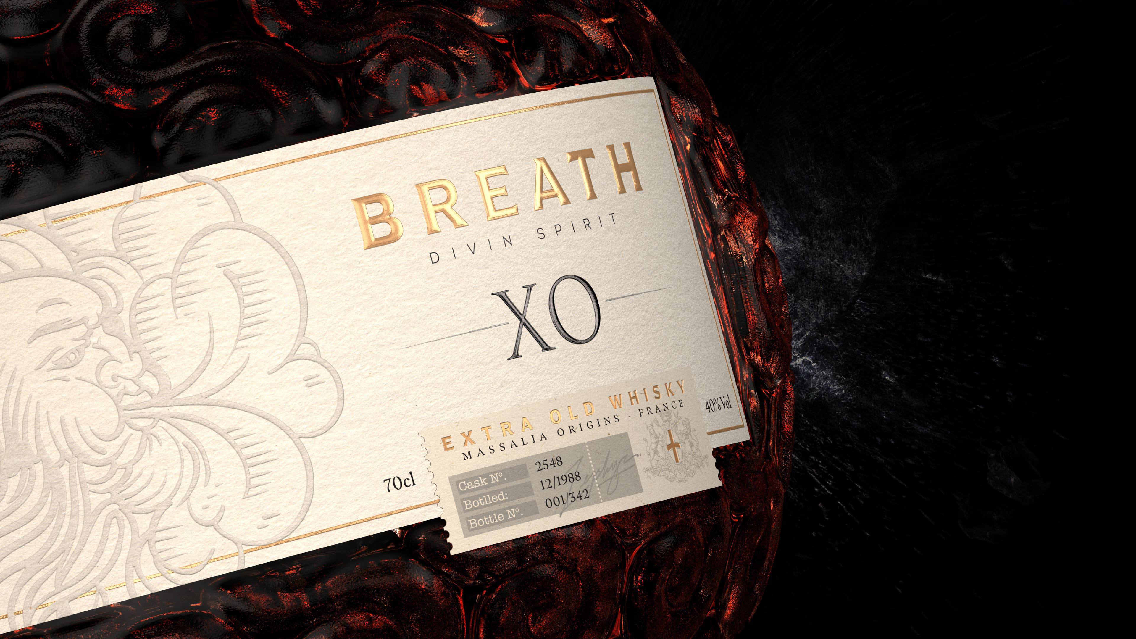 "Dans les temps anciens, les dieux et les humains vivaient en harmonie sur terre. Cette ère prospère a donné naissance à une grande civilisation pour laquelle l'agriculture n'avait aucun secret, et qui a développé, entre autres, un grand savoir-faire dans la culture et la distillation du houblon. Pour sceller cette union de paix à jamais et laisser un héritage pour les générations futures, ils décidèrent de créer un whisky de rare qualité et de le garder secret afin qu'il puisse traverser les âges. Des milliers d'années plus tard, Breath a été découvert par des explorateurs qui avaient entendu parler de la légende. Il a pu voir le jour, rappelant aux humains leur lien avec le divin qui avait été oublié au fil des âges..."