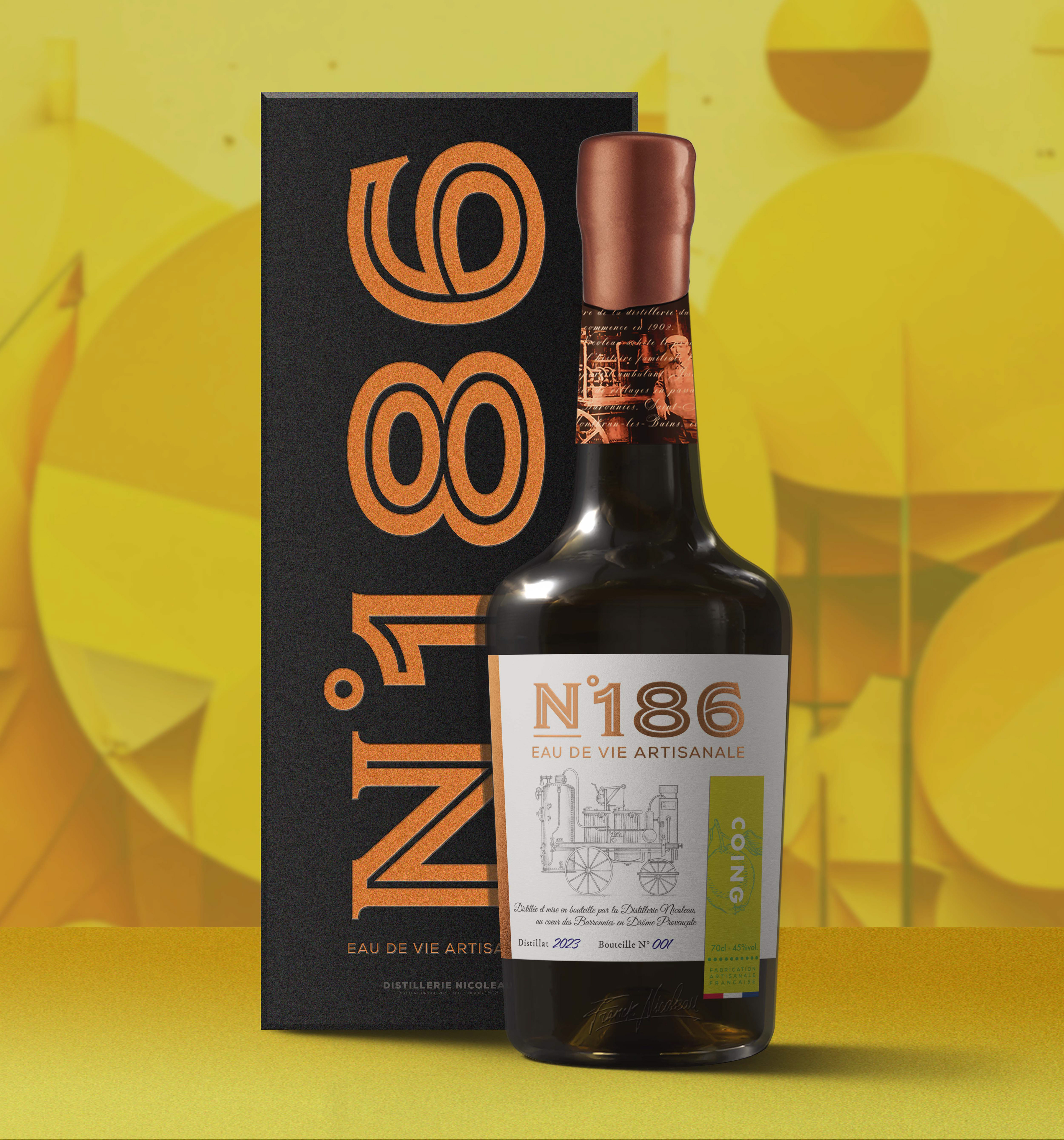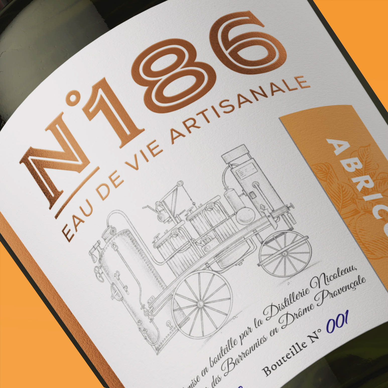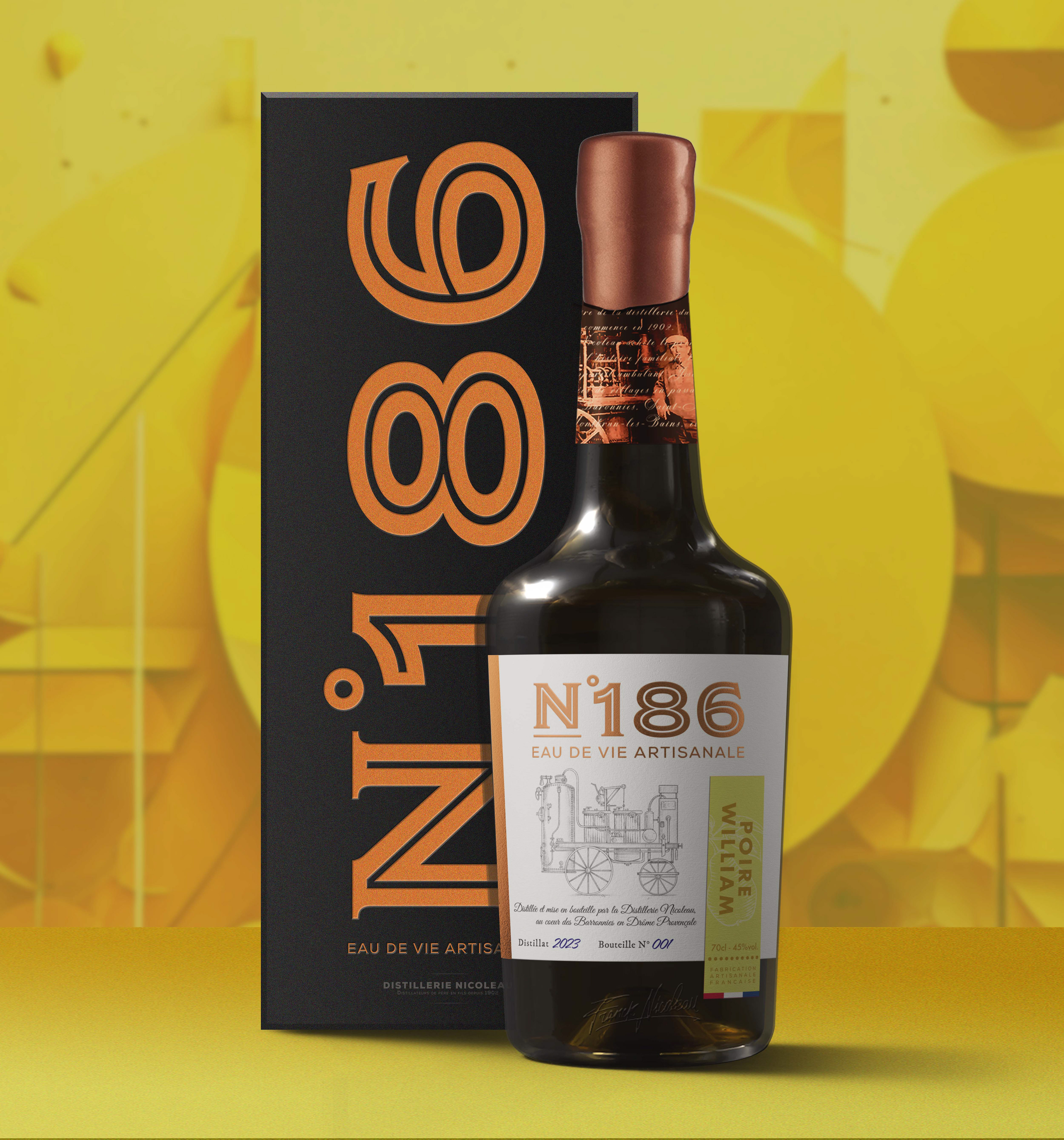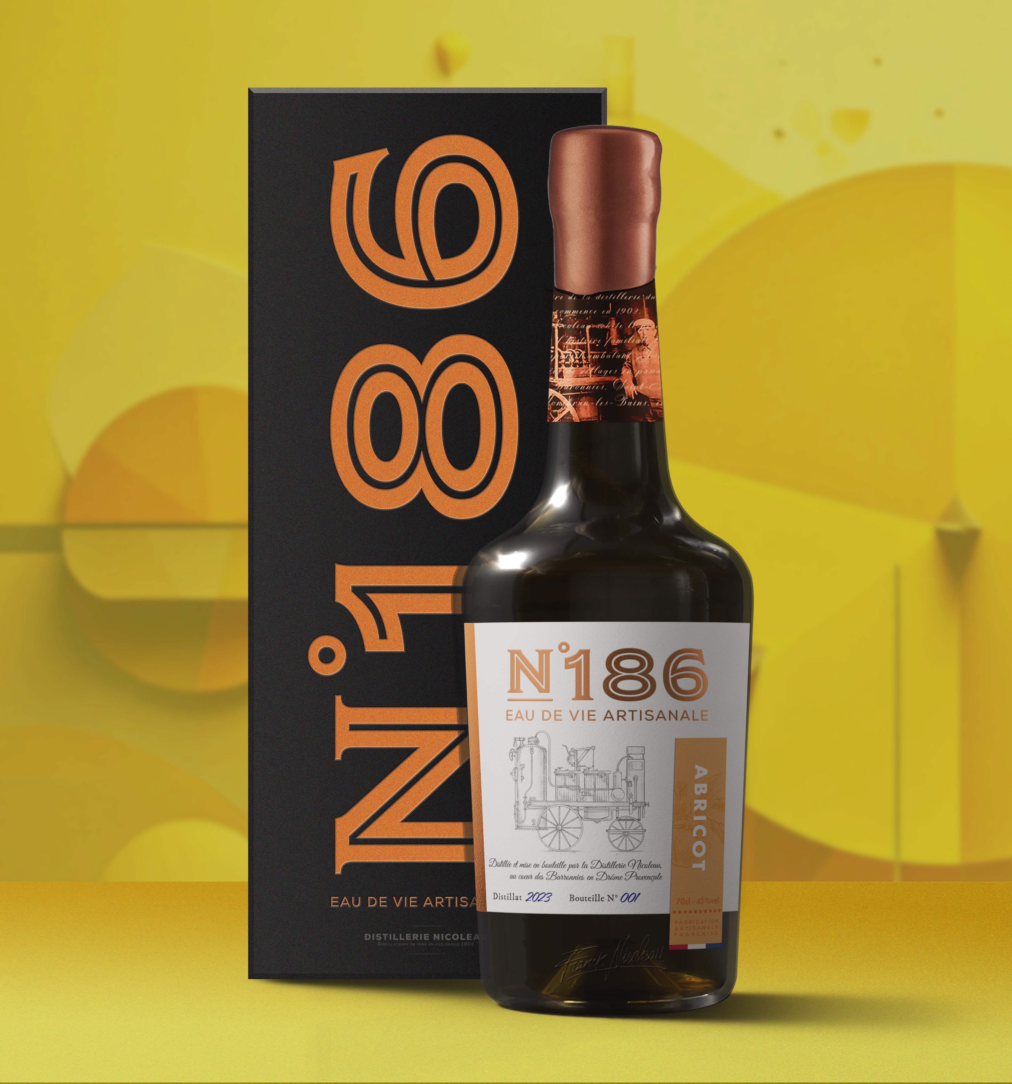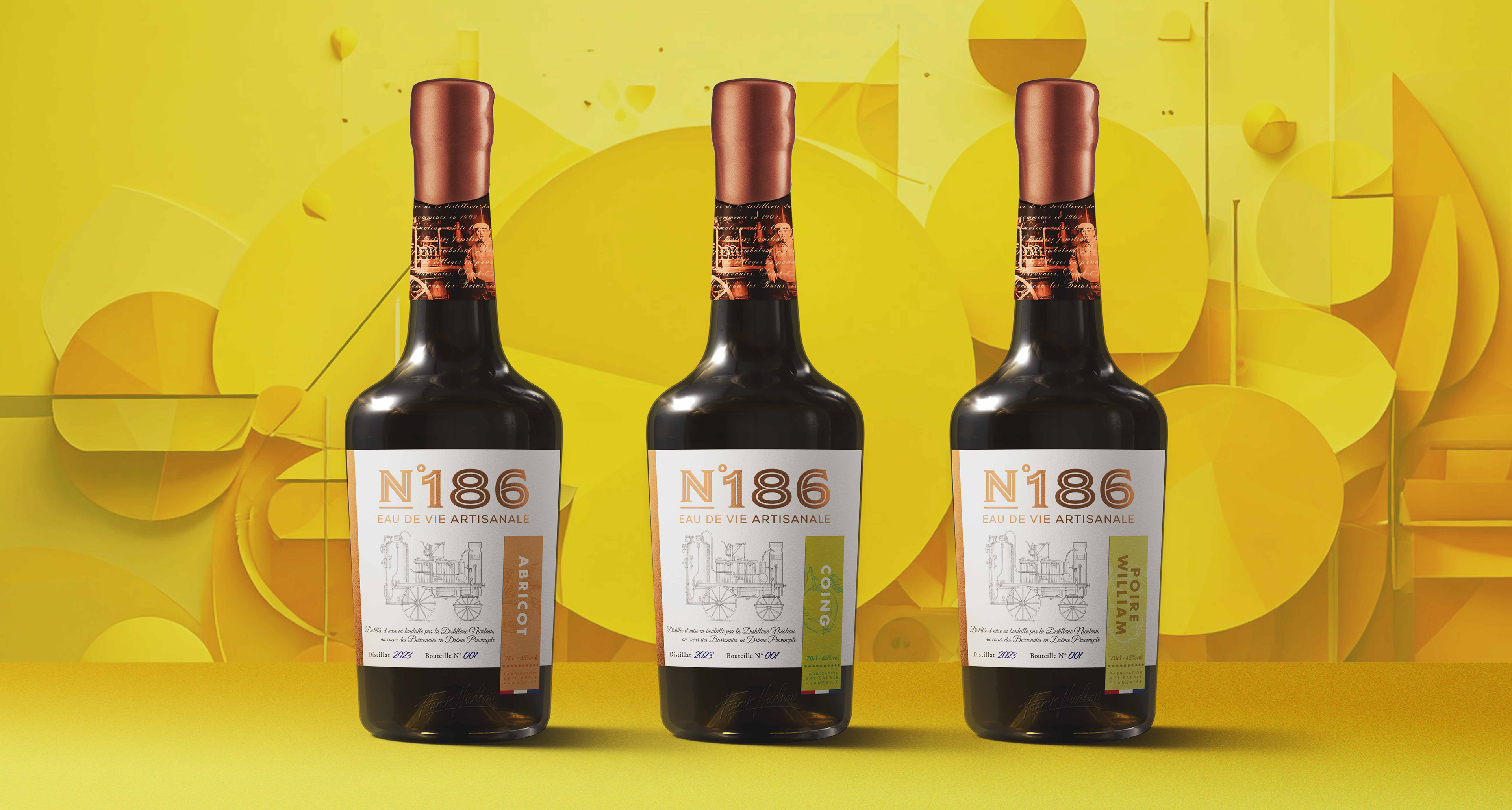 Inspirés par l’histoire d'Henri Nicoleau et de son alambic N°186, ce projet de création de marque revisite l’essence de la distillation artisanale en Drôme Provençale. L'identité développée évoque ses parcours à travers les campagnes, où il distillait sur place les fruits des producteurs locaux, incarnant proximité et respect du terroir. Avec un design mêlant tradition et modernité, chaque élément rend hommage à cet héritage en offrant une expérience visuelle et sensorielle unique, qui perpétue le caractère authentique et l’esprit nomade de cette aventure artisanale.